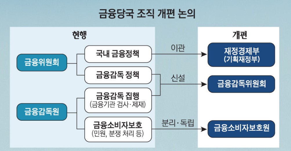 정치권에 따르면 국정기획위는 최근 대통령실에 최종안을 보고했다. 핵심은 △금융위 해체 △국내 금융정책 기능의 기획재정부 이관 △금융감독원과 통합한 금융감독위원회 부활 △금감원 금융소비자보호처 분리·금융소비자보호원 신설 등이다. 2008년 폐지된 금융감독위를 17년 만에 부활시키고 금감위원장이 금감원장을 겸임하는 체제로 운영하는 방안을 담았다.