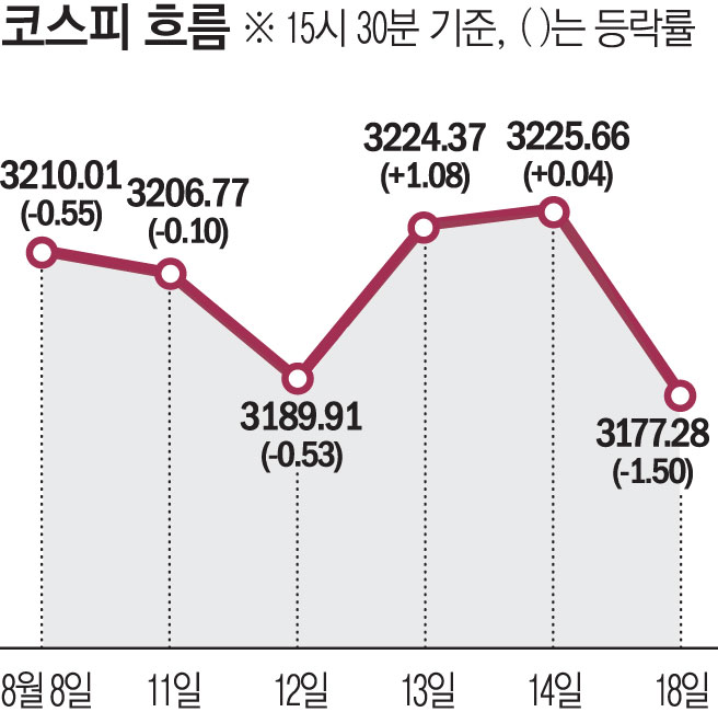 18일 한국거래소에 따르면 이날 코스피는 전장보다 48.38포인트(1.50%) 내린 3177.28에 장을 마쳤다. 지수는 지난 12일 이후 4거래일 만에 다시 3200선 아래로 추락했다. 미국·러시아 정상회담을 앞둔 경계감이 커진 데다 도널드 트럼프 미국 대통령이 반도체 관세 계획을 곧 발표하겠다고 밝히자 기술주를 중심으로 약세가 두드러졌다. 여기에 미국의 7월 생산자물가지수(PPI)가 전월 대비 0.9% 오르며 예상치를 크게 웃돌자 인플레이션 우려도 증폭됐다. 소비자들의 1년 기대 인플레이션도 4.5%에서 4.9%로 상승했다. 이러한 대외 불확실성이 국내 투자심리를 위축시키며 지수 하락 압력으로 작용했다.