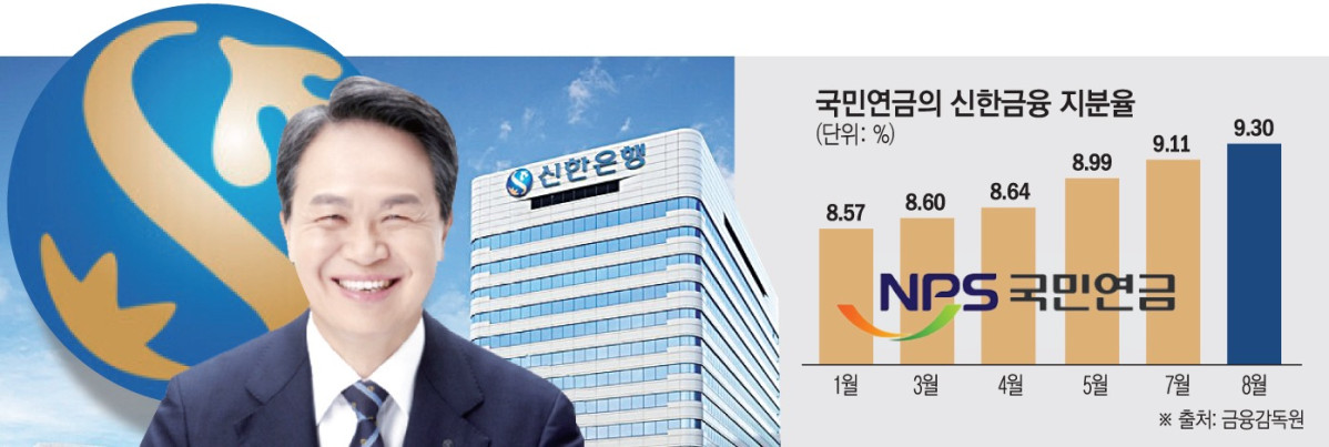 19일 금융감독원 공시에 따르면 국민연금은 이달 초 신한금융 주식 93만2081주를 순매수했다. 이에 따라 지분율은 전월(9.11%) 대비 0.19%포인트(p) 상승한 9.30%로 집계됐다. 지난해 7월 8.26%였던 지분율이 1년 만에 1%p 넘게 뛰며 사실상 10% 보유 한도에 근접한 상태다. 반면 다른 금융지주들은 차익실현에 나서면서 지분율을 줄였다.