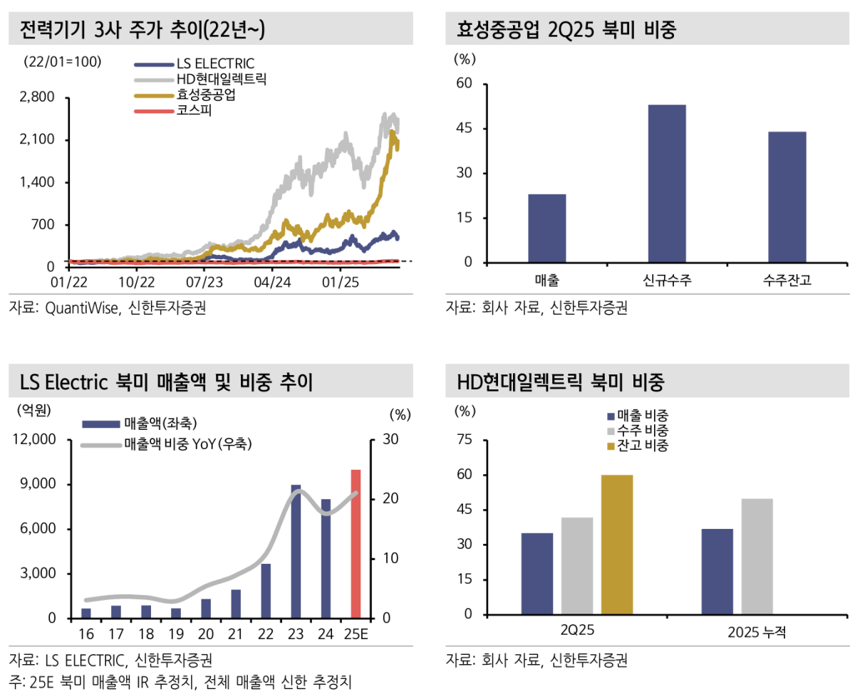 효성중공업 전력부문은 2분기 매출액 중 미국이 23%, 신규수주 중 53%, 수주잔고 44%로 북미 수주가 급증했다. LS일렉트릭의 상반기 미국 매출비중은 31%로 최근 업체별로 북미는 가장 큰 수익원이다.