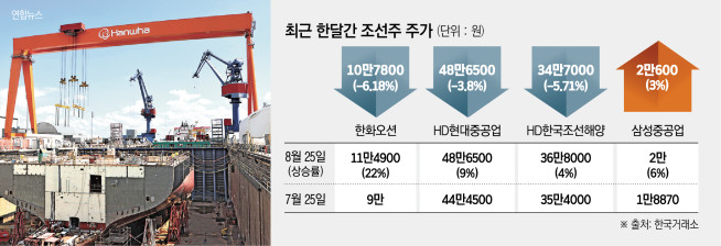 이날 개장전 증권가에서도 낙관적인 전망이 잇따랐다. 한국투자증권은 “트럼프 대통령이 조선·에너지 협력 가능성을 직접 언급한 만큼 업종 전반의 주가 모멘텀을 주목해야 한다”고 설명했다. 신영증권도 “정상회담에서 조선업 관련 구체적인 투자 계획은 나오지 않았지만 오히려 한국 조선업체들의 역할이 더 커질 수 있다는 점에서 조선주는 계속 보유할 필요가 있다”고 분석했다.