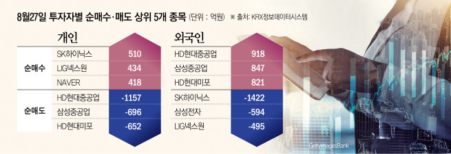 27일 한국거래소에 따르면 이날 외국인 순매수 상위 종목 1~4위가 모두 조선주였다. HD현대중공업(918억 원), 삼성중공업(847억 원), HD현대미포조선(822억 원), HD한국조선해양(370억 원)이 상위권을 싹쓸이했다. 방산주 한화에어로스페이스(199억 원)도 순매수 5위에 올랐다. 외국인이 정상회담에서 직접 언급된 조선 업종을 다시 집중 매수한 셈이다.