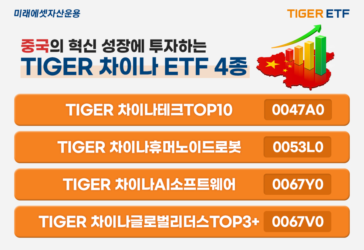 이정환 미래에셋자산운용 ETF운용부문 상무는 “인공지능(AI) 자립을 위한 중국 정부의 대규모 투자와 지원 예상되는 가운데 예금 금리 인하로 개인 자금까지 주식 시장으로 유입될 가능성이 크다”며 “TIGER ETF는 국내 중국 투자 ETF 시장 대표 주자로서 앞으로도 구조적 상승이 기대되는 중국 혁신 성장 테마에 대한 솔루션을 제공하도록 노력하겠다”고 말했다.