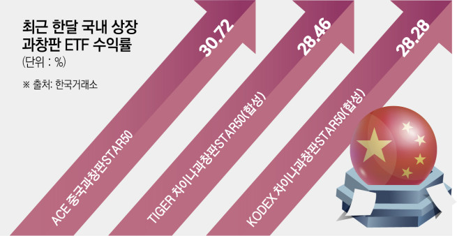 28일 한국거래소에 따르면 이날 기준 최근 1개월간 ACE 중국과창판STAR50 ETF는 30.72% 급등했다. 이 기간 국내 상장 전체 ETF 중 상승률이 가장 높다. TIGER 차이나과창판STAR50(합성), KODEX 차이나과창판STAR50(합성) 등도 각각 28.46%, 28.28% 오르며 수익률 4위, 5위에 올랐다.