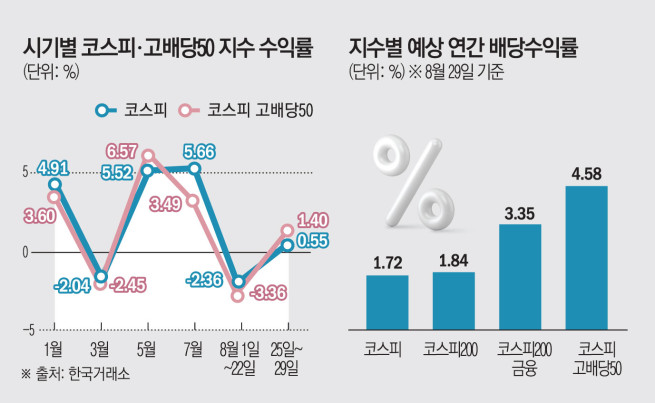 31일 한국거래소에 따르면 코스피 고배당50 지수는 이달 마지막 주(8월 25일~29일) 1.40% 올랐다. 같은 기간 코스피 지수(0.55%) 수익률을 웃돈다. 코스피 고배당50은 올해 하반기 들어 8월 셋째 주(7월 1일~8월 22일)까지 0.27% 하락하며 코스피(3.16%) 수익률을 밑돌았다가 최근 반전에 성공했다.
