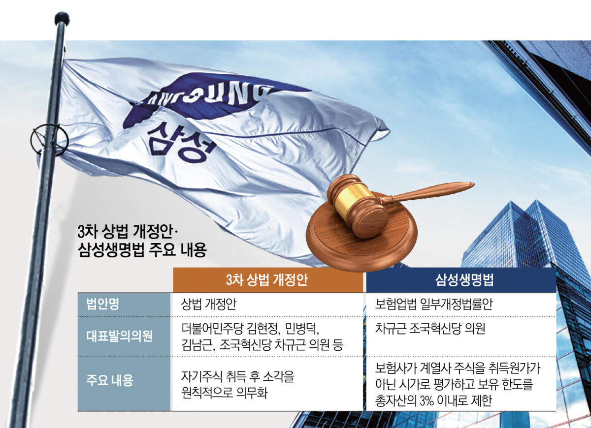 다만 여당이 앞으로 자사주 소각 압박 수위를 더욱 높일 경우, 삼성 역시 결국은 따라갈 수밖에 없는 상황에 몰릴 수 있다는 관측이 제기된다. 이 경우 자사주 지분 희석 효과로 그룹 전체의 지배력이 약화될 수 있다는 우려가 나온다. 국회 한 관계자는 “자사주가 어느 정도 있어야 경영권 방어가 되는데, 상법 개정안과 삼성생명법이 동시에 통과되면 지배구조 유지나 경영 전략 수립에서 어려움이 따를 수 있어 셈법이 복잡해질 것”이라고 말했다.