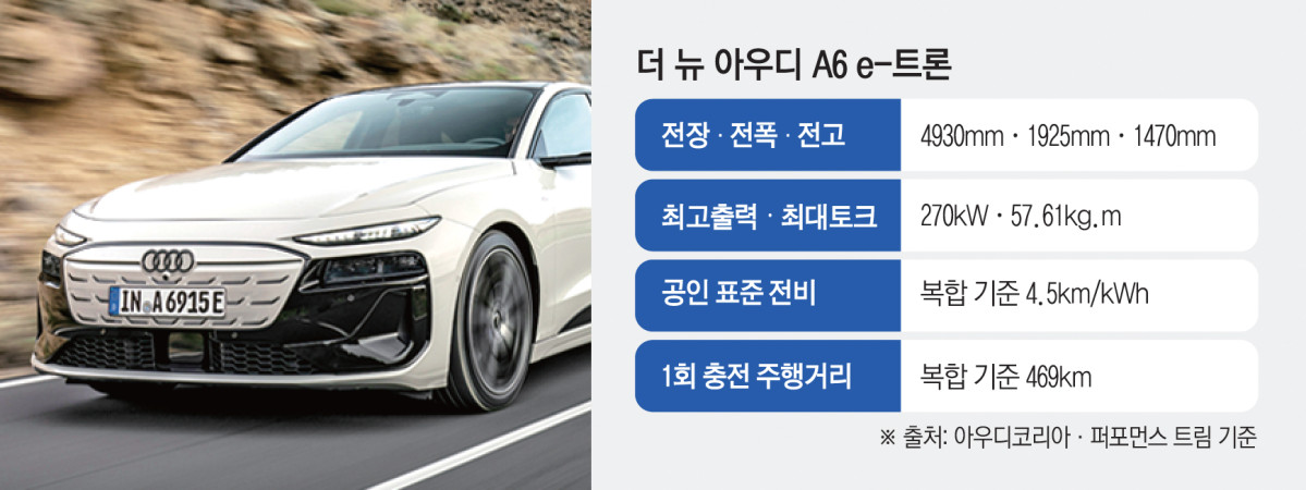 올해 다양한 신차 라인업으로 한국 시장을 공략하고 있는 아우디코리아가 실적 반등의 정점을 찍을 모델로 ‘더 뉴 아우디 A6 e-트론’을 출시했다. 해당 모델은 1억 원이 넘는 가격대에 걸맞게 세단 특유의 안정적인 주행감과 강력한 가속력을 겸비했다. 최근 서울 종로구 아우디코리아 본사에서 강원도 원주 내 한 레스토랑까지 왕복 약 240㎞를 A6 e-트론 S-라인 트림을 타고 달려봤다.