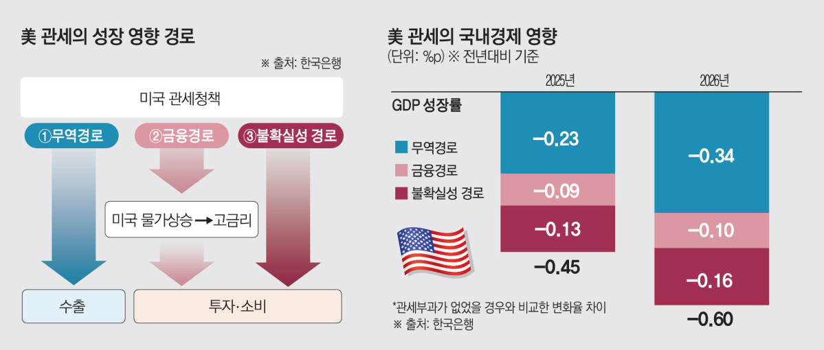미국 무역정책의 불확실성이 한국 경제 성장률을 끌어내릴 수 있다는 분석이 나왔다. 실제 관세 조정의 직접적 영향 외에도 불확실성만으로도 올해와 내년 성장률이 적지 않은 타격을 받을 수 있다는 경고다.