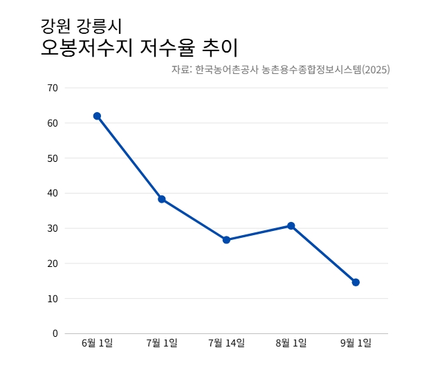 한국농어촌공사에 따르면 2일 오전 기준 오봉저수지의 저수율은 14.2%로, 역대 최저 수준의 저수율을 기록했다. 전날 오후 6시에 확인된 14.4%보다 0.2%p 더 떨어졌다. 강릉지역의 최근 6개월 강수량은 평년 대비 45.3%인 387.7mm다. 특히 이번 여름철은 1973년 이후 가장 적게 비가 내리면서 몇 주째 저수율 감소가 반복되는 추세다. 오봉저수지의 저수율은 한 달 사이 25%에서 20%로 떨어졌고, 불과 10여 일만에 15% 아래로 급락했다.