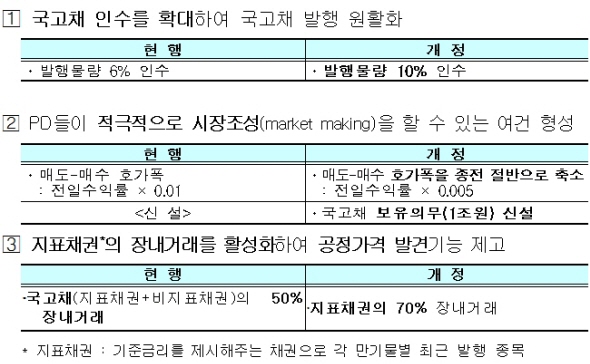 개선방안은 PD들이 적극적으로 시장조성할 수 있는 여건을 형성하기 위해 이들과 의견수렴을 거쳐 매도-매수 호가폭을 절반으로 축소해 호가를 통한 매매체결 가능성을 높이고 1조원 규모의 국고채 보유의무를 신설해 자기보유 국고채로 시장 조성 강화를 유도해 나가기로 했다.