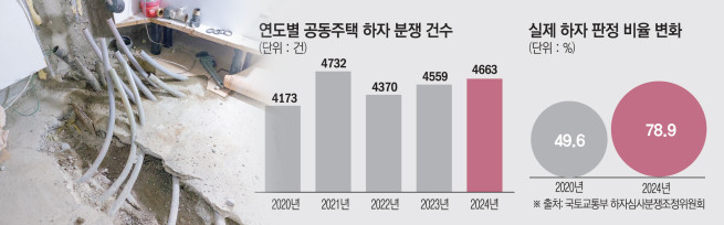 7일 국토교통부에 따르면 하자심사분쟁조정위원회에 접수되는 공동주택 하자 분쟁 건수는 늘어나는 추세다. 위원회가 처리한 분쟁 사건은 2020년 4173건에서 2021년 4732건으로 증가했다가 2022년 4370건으로 감소한 뒤 다시 2023년 4559건, 2024년 4663건으로 늘었다.