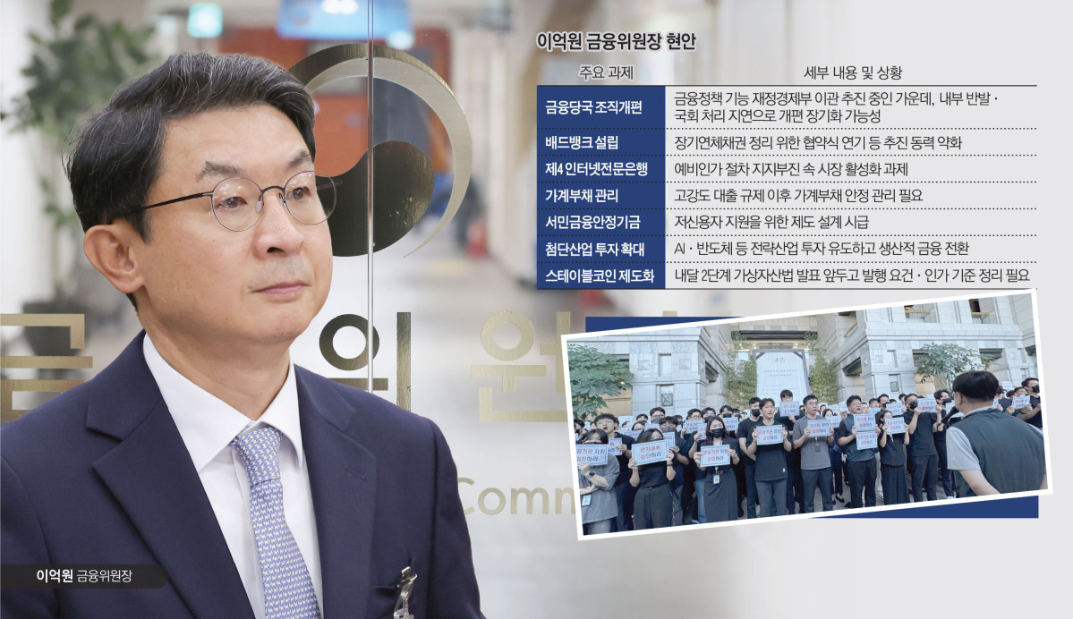이 위원장 앞에는 굵직한 정책 과제도 놓여 있다. 장기연체채권 정리를 위한 배드뱅크 설립 협약식은 애초 12일로 예정됐으나 연기됐고 제4인터넷전문은행 예비인가 절차도 지지부진하다. 가계부채 관리, 생산적 금융 전환, 서민금융안정기금 마련 역시 그의 리더십을 시험할 과제로 꼽힌다. 특히 서민금융안정기금은 대통령 공약이자 국무회의에서도 반복적으로 강조된 사안으로, 고금리 상황 속 저신용자 지원이 핵심이다. 이 대통령은 “어려운 사람이 더 비싼 대출을 쓰는 것은 잔인하다”며 제도 개선을 주문한 바 있다.