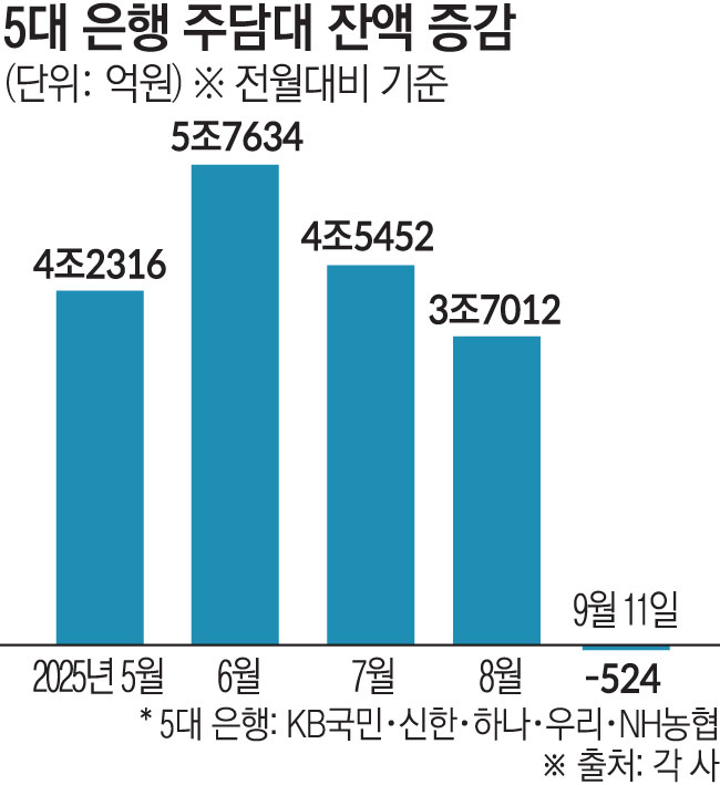 14일 금융권에 따르면 5대 은행(KB국민·신한·하나·우리·NH농협)의 11일 기준 가계대출 잔액은 763조702억 원으로 집계됐다. 지난달 말(762조8985억 원)보다 1717억 원 증가했으나 하루 평균 증가액은 156억 원으로 8월(1266억 원)의 8분의 1 수준에 그쳤다.