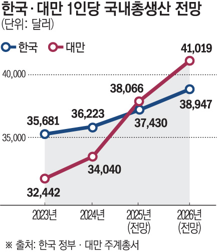 이런 전망이 현실화할 경우 한국은 2003년 1만5211달러로 대만(1만4041달러)을 제친 후 22년 만에 역전당하게 된다.