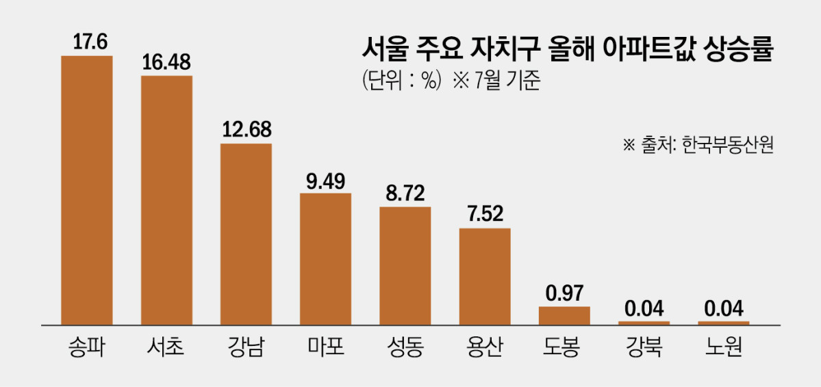 서울 평균 아파트값이 연초 대비 꾸준히 상승세를 이어온 가운데 자치구별 오름폭이 크게 차이나는 것으로 나타났다. 일명 '마용성'과 '강남3구' 등에서는 매매가격 변화율이 10% 내외를 기록하거나 크게 넘어섰지만, '노도강' 등 강북 지역에서는 0%대에 가까운 상승률을 기록하며 지역별로 격차가 컸다.