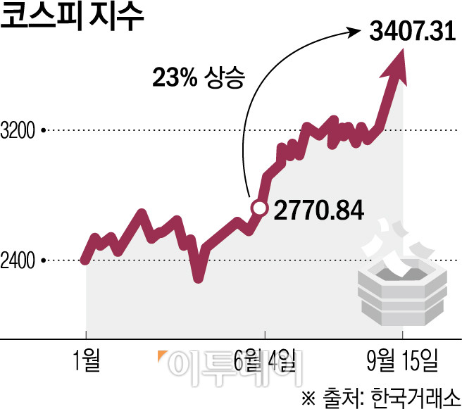주식 양도세 대주주 기준을 현행 50억 원으로 유지하기로 한 정부 방침과 미국 금리 인하 기대감이 맞물리며 코스피가 사상 처음으로 3400선을 넘어섰다. 15일 지수는 장중 한때 3420선을 돌파하며 10거래일 연속 상승, 4거래일 연속 사상 최고치를 새로 쓰는 기록을 세웠다.