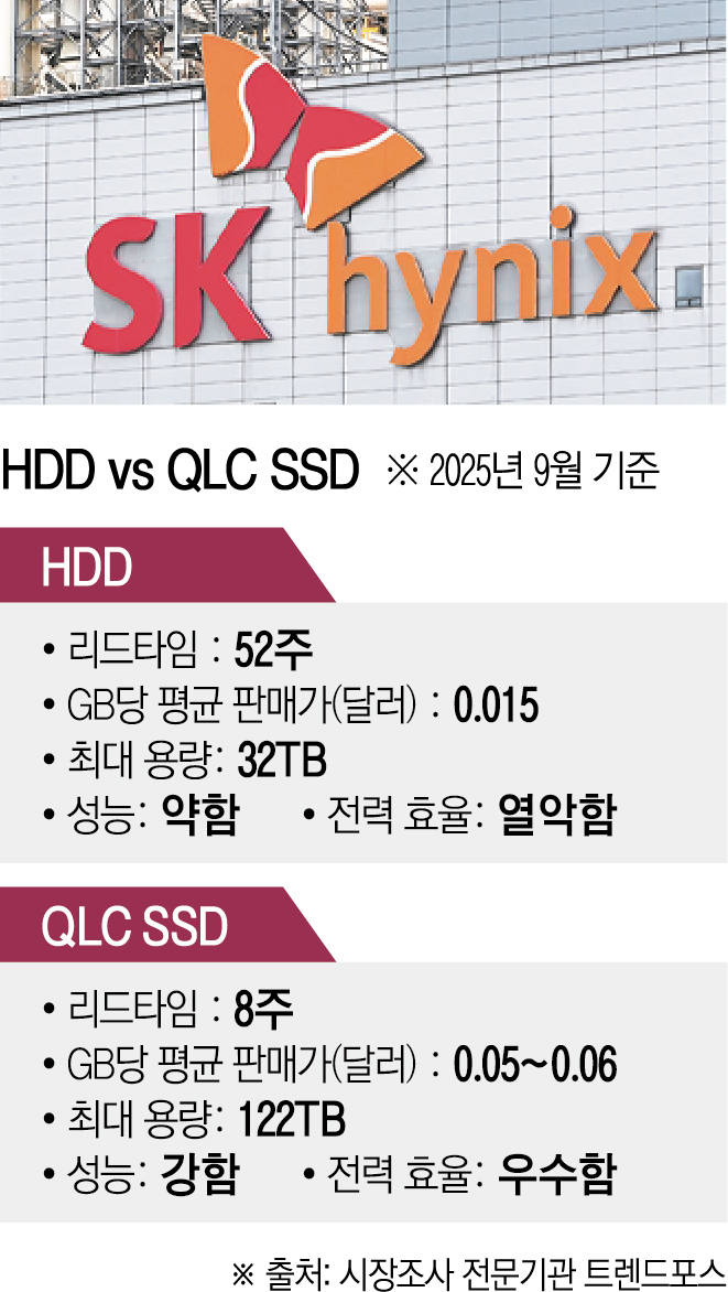 하드디스크드라이브(HDD) 가격이 급등하면서, 같은 저장장치인 낸드(NAND) 기반 솔리드스테이트드라이브(SSD) 수요가 빠르게 늘고 있다. 인공지능(AI) 기술 확대가 맞물리며 그 속도는 더욱 가속화할 전망이다. 업계 2위인 SK하이닉스는 자회사 솔리다임을 앞세운 쿼드레벨셀(QLC) 포트폴리오를 통해 직접적인 수혜를 누릴 것으로 기대된다.