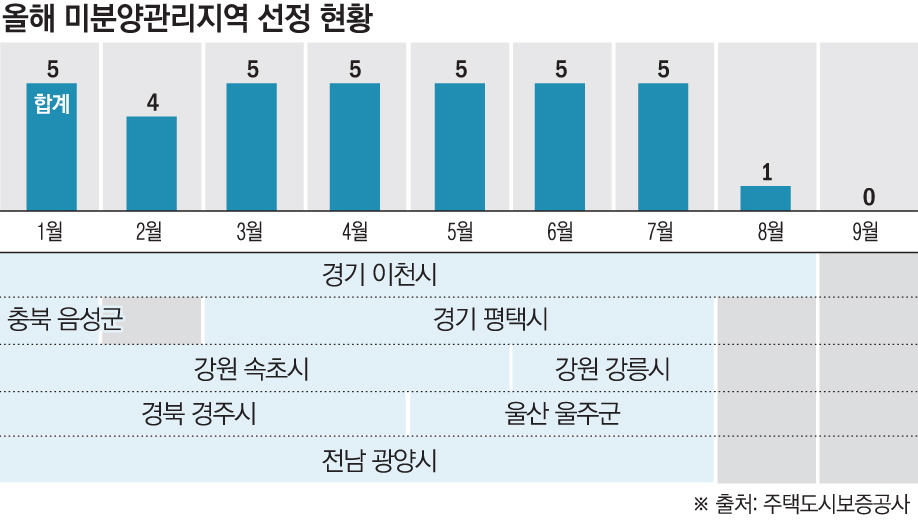 이천시 외에도 6월까지 관리지역에 포함됐던 평택시는 7월 말 기준 3482가구로 여전히 높은 미분양을 보유하고 있고 울산 울주군(1085가구), 강릉시(1120가구) 등도 상당한 미분양 물량을 기록하고 있음에도 현재는 모두 관리지역에서 제외된 상태다.