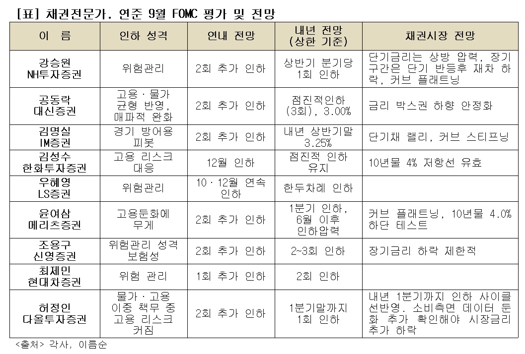 미국 연방준비제도(Fed·연준)의 9월 기준금리 인하가 고용 둔화 리스크 부각에 따른 ‘위험 관리(risk management)’ 차원의 보험성 인하라는 분석이 나왔다. 연내 두 차례 추가 인하가 가능하겠지만 내년 이후 추가 인하 속도에 대해서는 다른 전망을 내놨다. 이에 따라, 채권 수익률곡선(일드커브) 전망도 엇갈렸다.