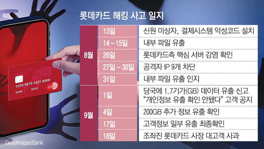 롯데카드는 최근 발생한 해킹 사고로 297만 명 회원 정보가 유출됐다고 밝혔다. 그중 28만 명은 유출 정보로 인해 카드 부정 사용 가능성이 있는 것으로 조사됐다. 롯데카드 측은 피해 발생 시 전액 보상하겠다고 재차 강조했다. 조좌진 롯데카드 사장은 사임도 고려 중이라고 했다.