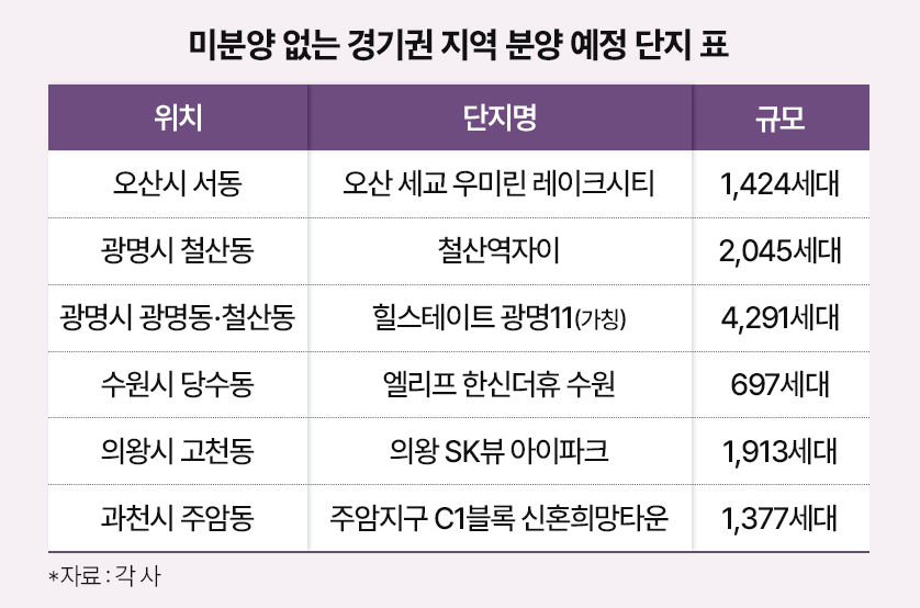 부동산시장 분석업체 부동산인포에 따르면, 연내 미분양이 없는 경기권 지역 중에서는 오산, 광명, 의왕, 수원, 과천 등에서 신규 분양이 이어질 예정이다.