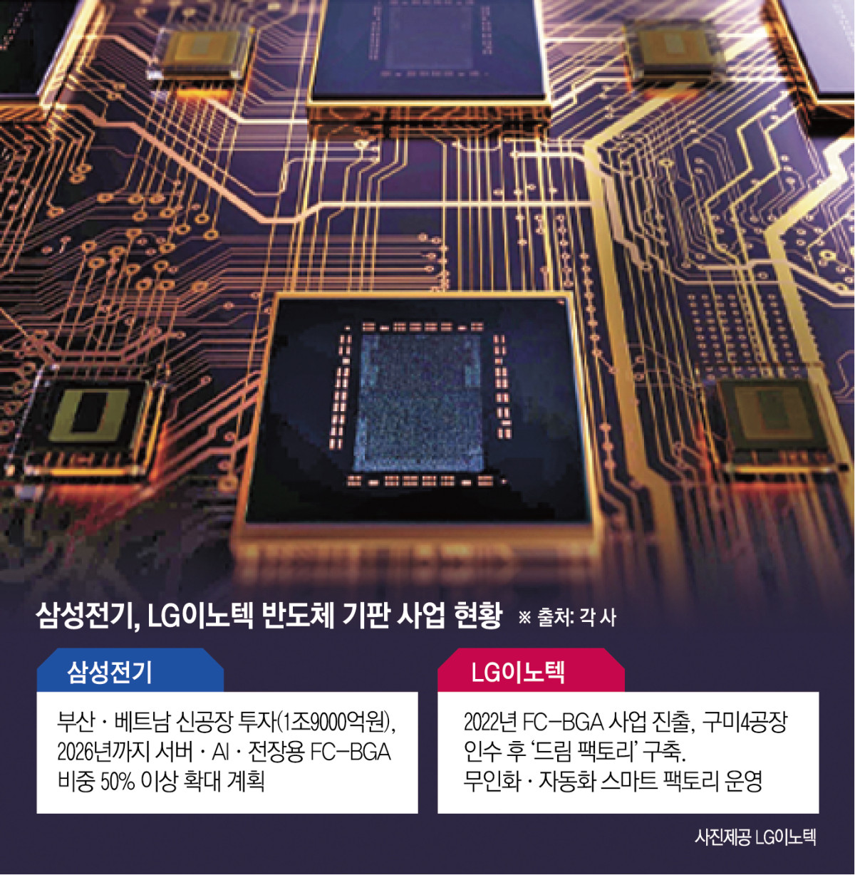 차세대 반도체 기판 시장을 두고 국내에선 삼성전기가 선두를 달리고 LG이노텍이 후발주자로 바짝 뒤쫓는 구도가 본격화되고 있다. 글로벌 인공지능(AI) 확산으로 FC-BGA(플립칩 볼그리드 어레이) 활용이 급격히 늘어나면서 양사는 대규모 투자와 첨단 생산기지 확보로 경쟁력을 키우며 일본·대만 업체가 장악한 시장을 따라잡기 위한 추격전에 뛰어드는 모습이다.