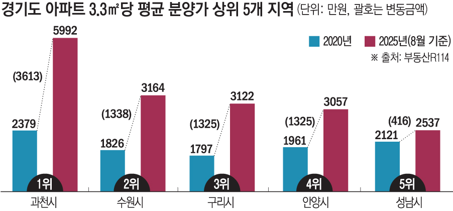 21일 부동산 업계에 따르면 6·27 대출규제에도 서울 집값은 상승세가 이어지는 가운데 준서울로 분류되는 경기권 지역들도 동반 상승하고 있는 것으로 나타났다. 부동산R114에 따르면 과천은 3.3㎡당 5992만 원으로 전국 최고 수준의 분양가를 기록 중이다. 안양(3057만 원), 수원(3164만 원), 구리(3122만 원) 등도 3000만 원 안팎을 형성했다. 앞서 5년 전인 2020년과 비교 시 3.3㎡당 과천 3613만 원, 수원 1338만 원, 구리 1325만 원, 김포 1235만 원, 안양 1096만 원 각각 상승했다.