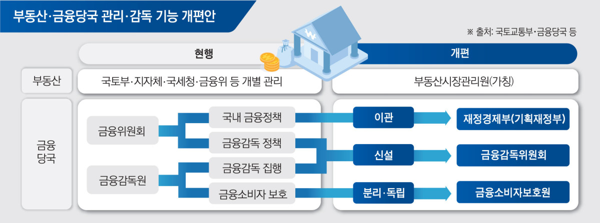 부동산 부문은 주택공급 확대와 함께 시장 교란 행위를 차단하고 금융 부문은 금융사고와 불완전판매 문제를 해소하겠다는 취지다. 하지만 부동산과 금융 모두 기존에 여러 기관이 감독 기능을 수행하고 있어 새로운 기관이 만들어지면 권한 중첩과 행정 비효율이 불가피하다는 지적이 나온다.