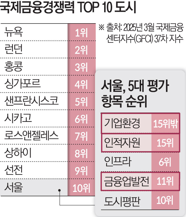 서울이 이 두 도시와 경쟁하기 위해서는 차별화된 강점을 부각해야 한다는 지적이다. 한국은 세계적인 제조업 강국이라는 실물경제 기반을 갖추고 있다. 여기에 디지털 인프라 경쟁력, 국민연금 등 막대한 연기금 자금은 서울만이 내세울 수 있는 무기다.