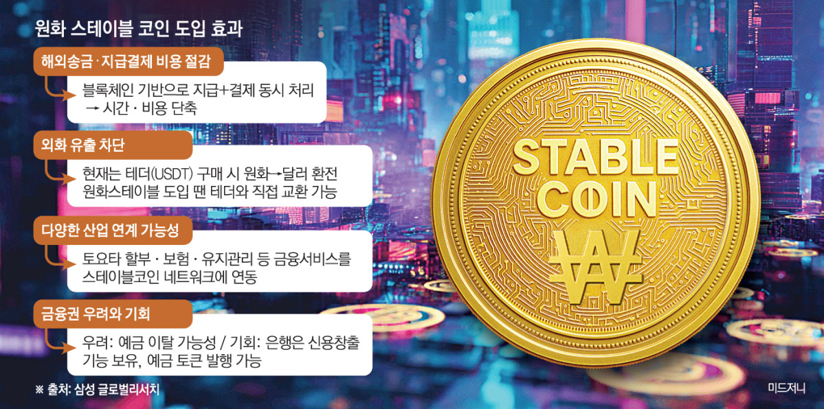 스테이블코인을 활용하면 기업의 해외송금 비용을 대폭 줄일 수 있다는 분석이 삼성 연구진을 통해 나왔다. 원화 스테이블코인이 도입될 경우 가상자산 거래 과정에서 발생하는 달러화 유출을 차단할 수 있을 것이라는 전망도 제시됐다.