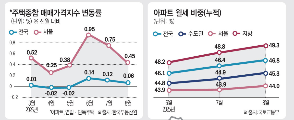 전국 주택 시장의 월세 비중이 꾸준히 늘고 있는 가운데 전세 매물은 급감하며 전셋값이 치솟고 있다. 정부의 6ㆍ27 대출 규제가 전세 대출 문턱을 높이면서 집주인들이 월세 선호로 돌아섰고, 가을 이사철 수요까지 겹치면서 전세 수급 불균형이 심화하는 모습이다.