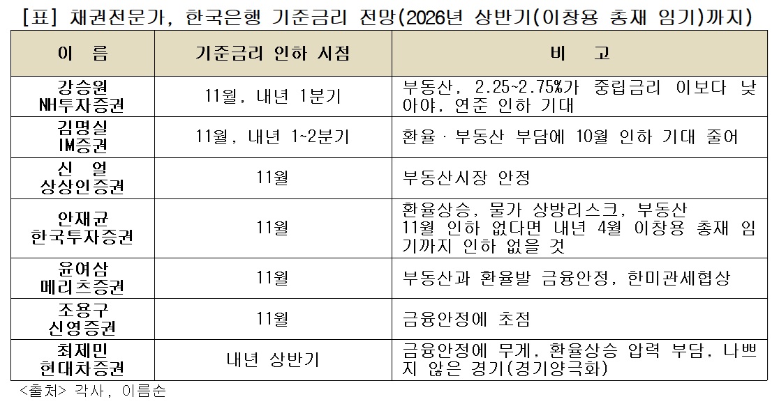 반면, 추가 인하 가능성이 아예 없을 수 있다는 예상도 있었다. 안재균 한국투자증권 연구원은 “환율 급등과 물가 상방리스크, 부동산 불안이 겹치며 10월 인하 명분이 약하다”며 “11월 인하가 없다면 이 총재 임기 내 추가 인하는 없을 것”이라고 지적했다.