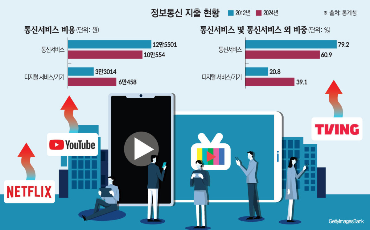 2012년 전체 정보통신 지출에서 통신요금 비중은 79.2%였으나, 2024년에는 60.9%로 하락했다. 같은 기간 디지털 서비스·기기 비중은 20.8%에서 39.1%로 확대됐다. 통신요금 중심의 소비 구조가 디지털 구독 중심으로 전환되고 있음을 보여주는 대목이다.