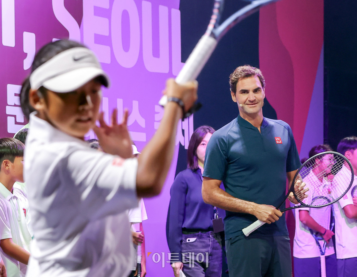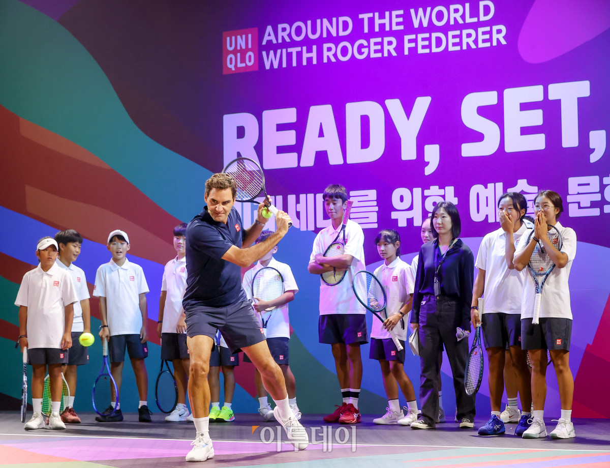유니클로(UNIQLO)가 글로벌 이벤트 시리즈인 ‘로저 페더러와 함께하는 세계 여행(Around the World with Roger Federer)’을 13일 서울에서 개최했다. 이날 로저 페더러가 유소년 선수들과 코칭 세션을 진행한 뒤 함께 기념촬영을 하고 있다. 사진제공=유니클로