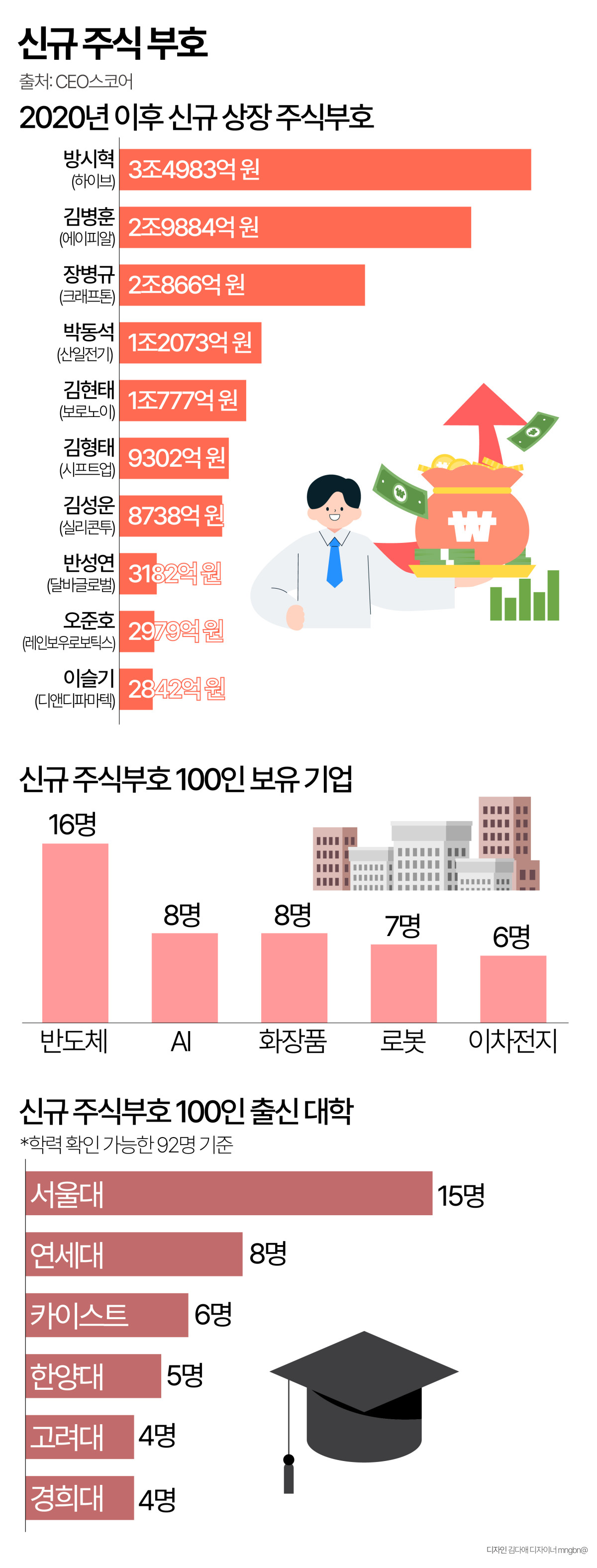 15일 기업데이터연구소 CEO스코어가 올해 9월 말 기준 2020년 이후 신규 상장한 기업 창업자의 주식가치(9월 말 종가 기준)를 조사한 결과, 상위 100인이 보유한 주식가치가 총 22조4836억 원에 달했다.