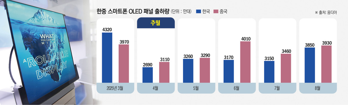 중국이 스마트폰용 유기발광다이오드(OLED) 패널 시장에서 5개월 연속 한국을 추월했다. 그간 국내 기업이 지켜온 ‘OLED 강국’의 지위가 흔들리고 있다는 평가다. 기술력 중심의 초격차 전략이 흔들릴 경우, TV 등 대형 OLED 분야까지 주도권이 넘어갈 수 있다는 위기감이 커지고 있다.