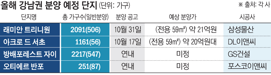 20일 분양 업계에 따르면 연내 △래미안 트리니원(삼성동) △아크로 드 서초(서초동) △오티에르 반포(반포동) △방배포레스트 자이(방배동) 등 주요 강남권 단지 분양을 앞두고 있다. 아크로 더 서초는 17일에 입주자 모집공고가 나왔고, 래미안 트리니원은 31일 분양 일정에 돌입한다.