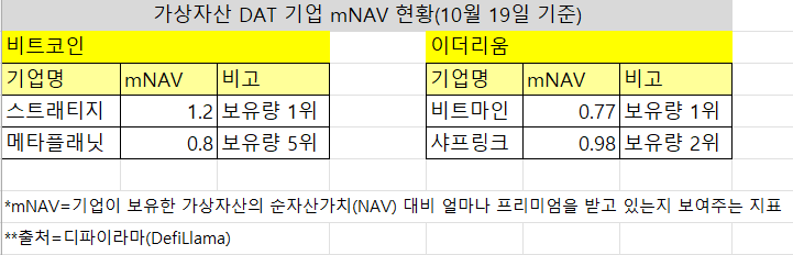 반면, 대다수 DAT 기업들의 mNAV는 1을 밑돌았다. 일본의 대표 비트코인 DAT 기업이자 전 세계 비트코인 보유량 5위인 메타플래닛은 0.95로 1 미만을 기록했다. 이더리움 DAT 1, 2위 기업인 비트마인과 샤프링크는 각각 0.77, 0.98을 기록하며 더욱 큰 디스카운트를 받고 있다.