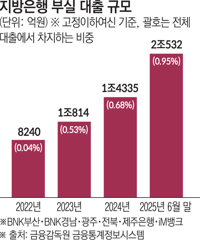 연도별로 보면 지방은행의 NPL 규모는 △2022년 말 8240억 원 △2023년 말 1조814억 원 △2024년 말 1조4335억 원으로 매년 증가하면서 올해 2조 원(6월 기준)을 넘어섰다.