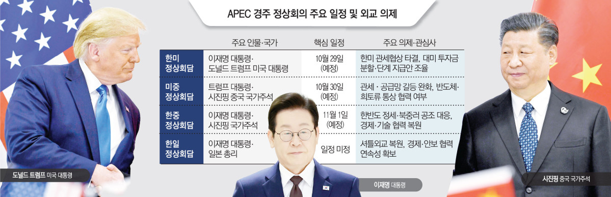 도널드 트럼프 미국 대통령과 시진핑 중국 국가주석이 이달 말 경주 아시아태평양경제협력체(APEC) 정상회의에서 마주한다. 글로벌 통상 갈등의 두 축이 한자리에 모이면서, 경주는 세계 외교의 중심 무대로 부상했다. 관세와 공급망을 무기 삼아 맞붙은 미·중의 대결 한가운데서 이재명 대통령은 두 강대국 사이의 외교 균형을 잡아야 하는 과제를 안게 됐다. 또 교착 상태가 길어지고 있는 한·미 관세협상 역시 APEC 정상회의를 계기로 돌파구 마련에 나서야 한다. 이 대통령의 ‘실용외교’가 실질적 성과를 거둘 수 있을지, 시험대가 될 것이란 전망이다.