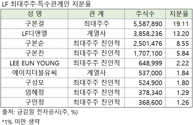 LF디앤엘의 주주 구성은 장남 성모 씨가 91.58%로 최대주주이며, 장녀 민정 씨가 8.42%를 보유하고 있는 사실상 개인 회사다. 구 회장이 자신과 오너일가의 지분을 성모 씨에게 증여해 최대주주 자리에 앉혔다. 또한, 두 남매는 LF디앤엘 지분 외에 LF 지분도 각각 1.80%, 1.26%씩 개인적으로 보유하고 있다.