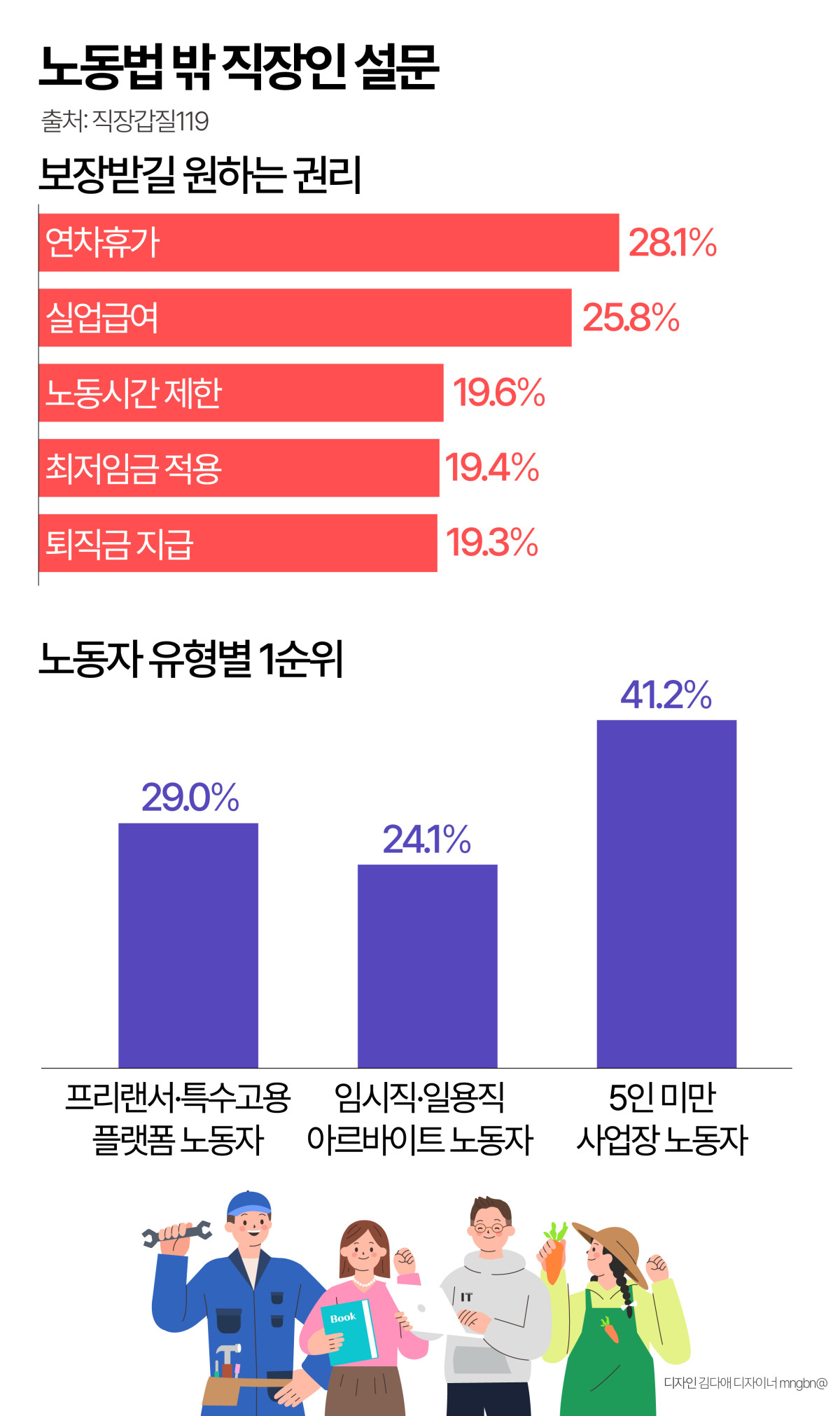 직장갑질119가 전국민주노동조합총연맹 법률원의 지원을 받아 여론조사 전문기관 글로벌리서치에 의뢰해 지난달 1일부터 14일까지 전국 만 19세 이상 '노동법 밖 직장인' 1000명을 대상으로 설문조사를 진행한 결과 가장 시급히 보장받길 원하는 권리는 '연차휴가'(28.1%)였다.