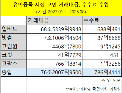 특히 유의종목 지정 전후로 거래량이 급증하는 이른바 ‘유의빔’ 현상이 반복되면서, 거래소가 단기적으로 수수료 수익을 챙기는 구조적 문제가 생길 수 있다는 우려도 나온다. 이헌승 국민의힘 의원실이 국내 원화마켓 거래소(업비트·빗썸·코인원·코빗·고팍스)로부터 제출받은 자료에 따르면, 2023년부터 올해 8월까지 유의종목 지정 코인 거래 수수료 총합은 786억4111만 원에 달했다. 거래대금은 같은 기간 76조2007억 원으로 집계됐다.