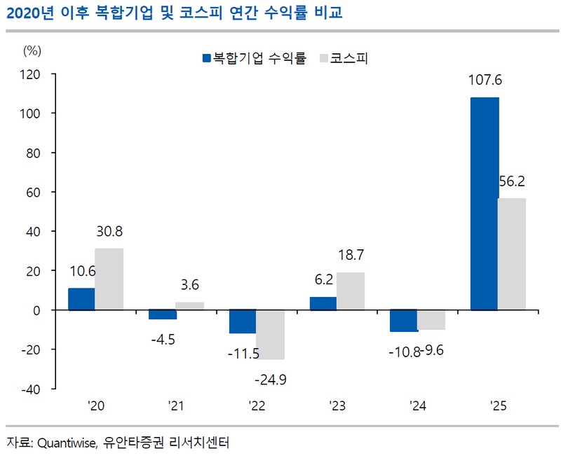 25일 유안타증권에 따르면 지주업종 주가는 17일 기준 연초 대비 107.6% 오르며 같은 기간 코스피 상승률(56.2%)을 압도했다. 지주업종이 과거 주주가치 훼손 논란으로 디스카운트를 겪었으나, 2024년 기업 밸류업 프로그램과 2025년 상법 개정 등 주주가치 제고를 위한 규제 변화와 시장 인식 개선에 힘입은 결과로 풀이된다. 특히 이사의 충실 의무 대상이 ‘회사 및 주주’로 확대된 1차 상법 개정 등이 디스카운트 해소의 결정적 계기가 됐다는 분석이다.