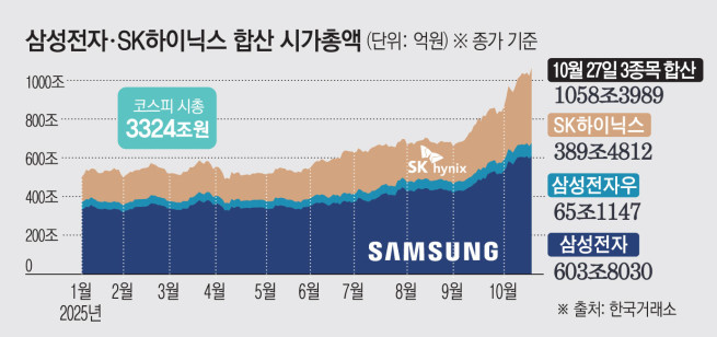 사상 초유의 코스피 4000시대 개막의 일등 공신은 단연 ‘K-반도체’였다. 이번 랠리는 반도체 산업의 압도적인 성장이 없었다면 불가능했다는 평가다. 특히 삼성전자와 SK하이닉스 두 기업의 시가총액 합산액이 1000조 원을 돌파한 것은 한국 증시의 체급이 글로벌 수준으로 변화했음을 상징적으로 보여준다.