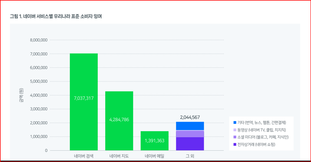 그 외 소셜미디어, 전자상거래, 동영상, 웹툰 등 나머지 서비스 영역에서는 전체적인 가치가 1047만 원으로, 네이버의 기여분이 204만 원으로 추정됐다.