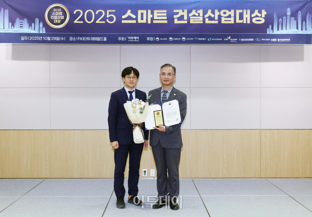 29일 서울 여의도 FKI타워 컨퍼런스센터에서 열린 ‘2025 스마트 건설산업대상’에서 종합대상인 국토교통부장관상을 수상한 배양수 서울주택도시개발공사(SH) 안전경영실장이 시상자인 천재민 국토교통부 해외건설지원과장과 기념촬영을 하고 있다. 이투데이가 주최한 ‘2025 스마트 건설산업대상’은 올바른 건설문화와 고용창출, 스마트 시대를 선도할 건설산업 유관 업체들의 성과를 발굴하고 이를 대내외에 알려 업계의 건전한 경쟁을 유도하기 위한 자리다.
