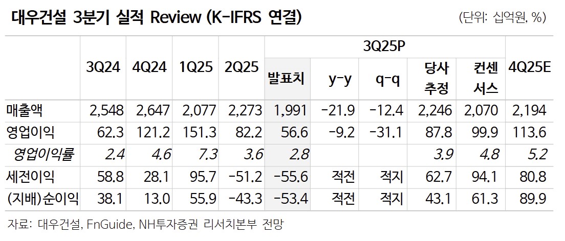 이은상 NH투자증권 연구원은 “해외 수주 성과가 지연되고 주택 일부 현장에서 청약 미달이 발생하는 등 수익성 리스크가 병존하고 있다”며 “3분기에도 해외 현장의 일회성 비용이 발생하면서 컨센서스를 하회하는 실적을 냈다”고 평가했다.