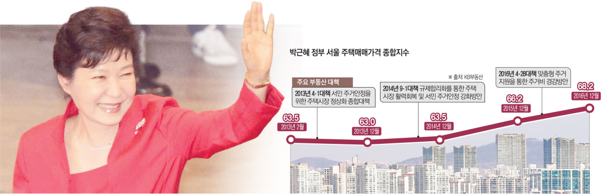 정책 완화의 효과는 박근혜 정부 임기 내내 나타났다. KB부동산 통계에 따르면 전국 아파트 평균 가격은 임기 초 2억6015만 원에서 2017년 3억1949만 원으로 22.8% 상승했다. 서울은 같은 기간 18.7% 오르며 처음으로 평균 6억 원을 넘어섰다. 주택종합매매가격지수 역시 2013년 말 전국 기준 70.7에서 2016년 말 76.4로 약 8.1%, 서울 62.9에서 68.2로 8.4% 상승했다.