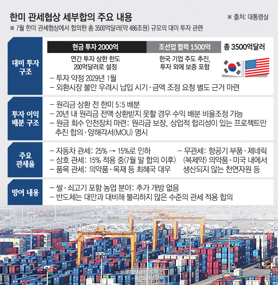 3일 국회와 정부 부처 등에 따르면 이번 합의의 큰 틀은 미국의 관세를 25%에서 15%로 낮추고, 한국은 3500억 달러 투자 패키지 중 2000억 달러를 현금으로 연 200억 달러 상한으로 집행하는 구조다. 조선·해양플랜트(MASGA) 협력도 포함됐다.